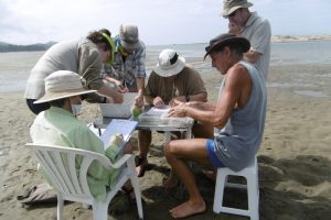 Once every month the same four sites in Mangawhai Harbour were visited around low tide. At each site three drags of the net were done and the contents collected, identified, counted and measured. The catch was then returned to the water to continue growing.